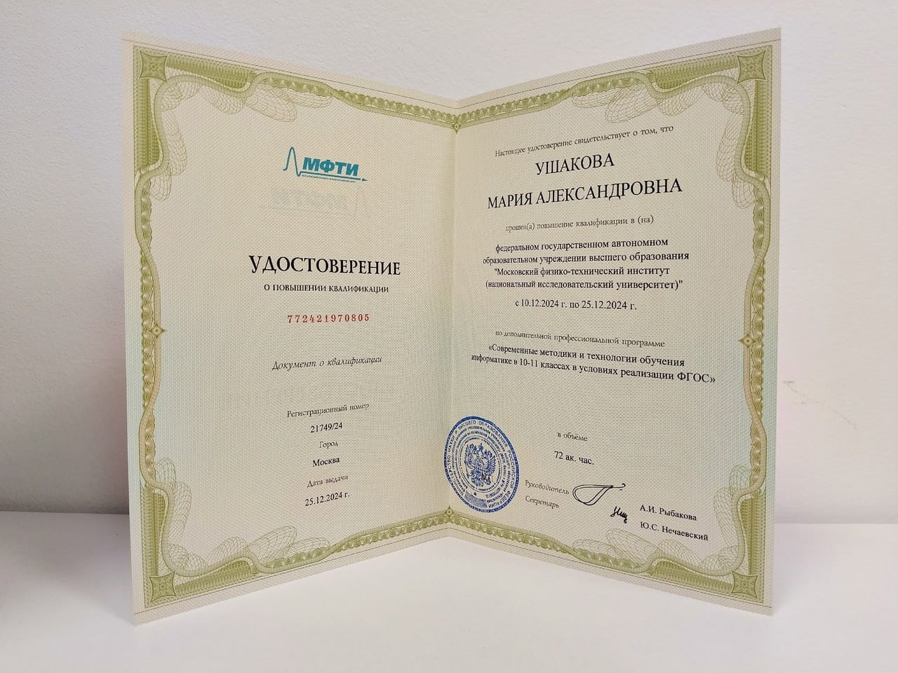 И вот мы получили новое удостоверение! Педагог дополнительного образования ЦЦО «IT-куб» Мария Александровна Ушакова прошла курсы повышения квалификации в ФГАОУ ВО «Московской физико-технический институт (национальный исследовательский университет)» г.Москва по профессиональной программе «Современные методики и технологии обучения информатике в 10-11 классах в условиях реализации ФГОС».