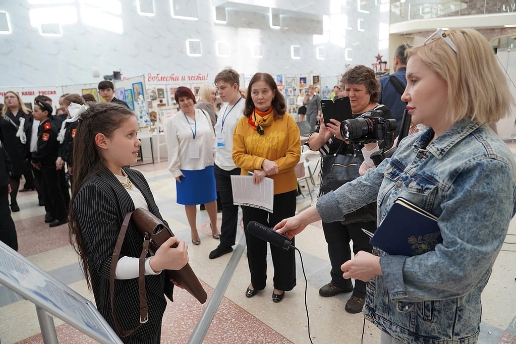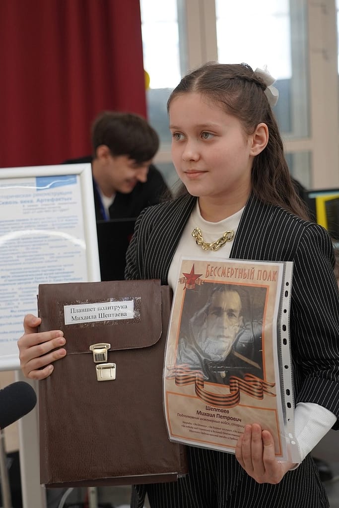 👨🎓Булдакова Риана, учащаяся 4 «А» класса МБОУ СОШ №1 им Н.К.Крупской провела под руководством своего учителя начальных классов Елены Ивановны Юренко большую научно-поисковую работу и создала целый лаббук в форме военного планшета о своем прадедушки политруке Михаиле Шептаеве. На выставку она принесла старинную серебряную ложку, которую он пронес через всю Великую Отечественную войну как теплое воспоминание о доме и своей семье, ради которых он побеждал в каждом сражении и принес мир и Победу на свою родную землю. Это самая ценная семейная реликвия, хранящаяся в семье школьницы, поэтому для формирования экспозиции о ее Герое в музее школы обучающиеся Центра цифрового образования Сергей Ковтков и Кирилл